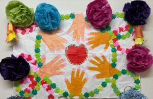 ハートとクローバーの折り紙で輪を作り、手と手を繋ぎました✨