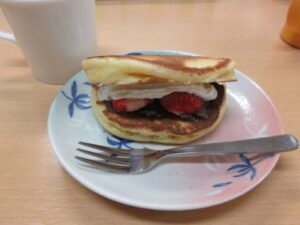 おやつの時間に合わせて今回は、焼きたてのパンケーキに『粒あん・いちご・生クリーム』をトッピング!!