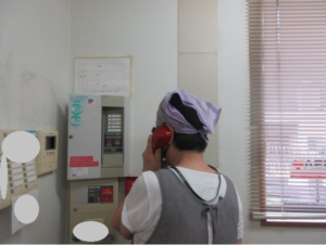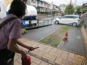 今回は夜間に火災が発生したという想定で消防署への通報、初期消火、避難訓練を行いました。